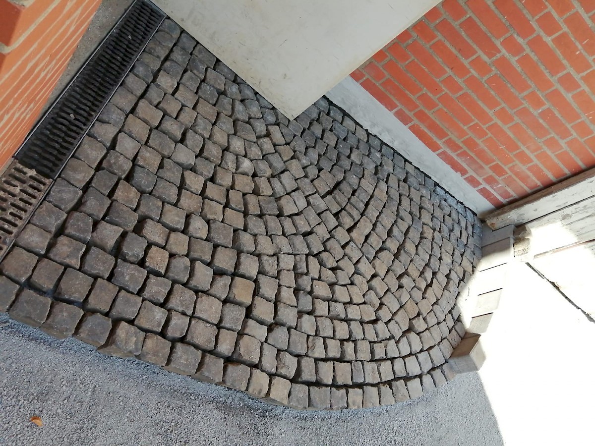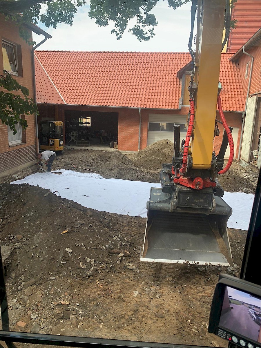 Diese Neugestaltung eines Hofes steht ganz unter dem Motto: neuer, schöner, moderner. Dabei werden die alten Pflastersteine herausgenommen und der gesamte Unterboden ausgetauscht und erneurt. Nach dem Setzen der Borde wird der Hof mit UNI Verbundpflaster aus Beton komplett neu gepflastert.