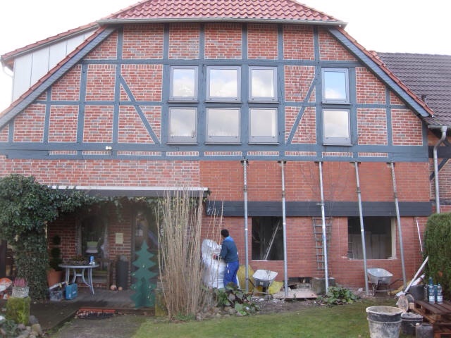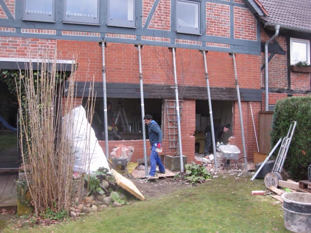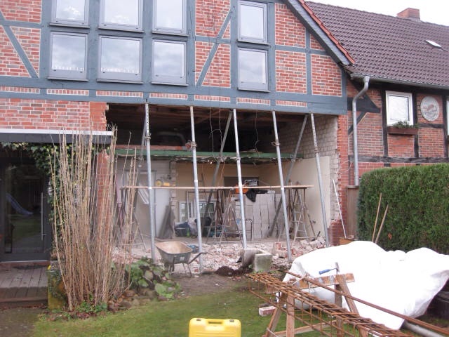 Dazu wird die Fachwerkfassade abgestützt und der untere Teil der Fassade nach und nach abgetragen.
